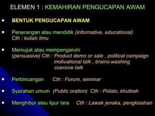 Terdapat empat elemen penting yang asas dalam pengucapan awam yang wajib ada dalam diri seseorang. Abdul Muati Ahmad 1994 dalam bukunya. Menurut Connoly JE 1974 pengucapan awam merupakan satu komunikasi yang boleh membuai pendengar ke alam yang ditentukan oleh penutur.