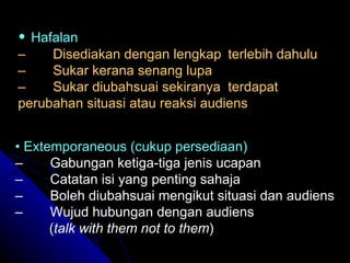 Membawa kertas atau teks ucapan. JENIS-JENIS PENGUCAPAN AWAM DR. Dihafal - ucapan yang dihafal perkataan demi perkataan dari teks.